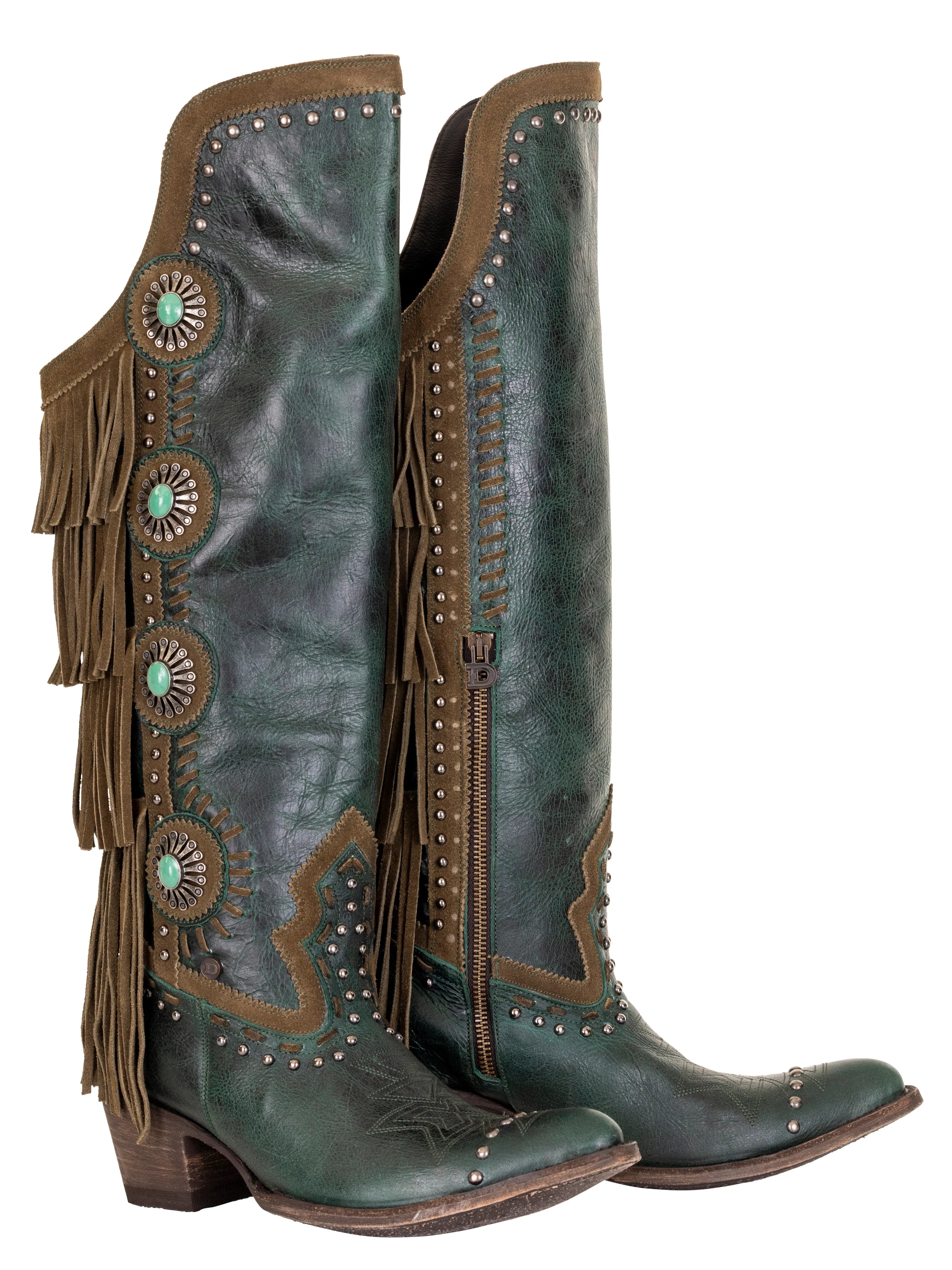 Warning: You may drop some jaws in these irresistible over-the-knee beauties. The supple leather shaft is complemented by custom (faux) turquoise-embellished conchos down the side and four tiers of fringe down the back that demand attention with every step. Boot up and stand out!