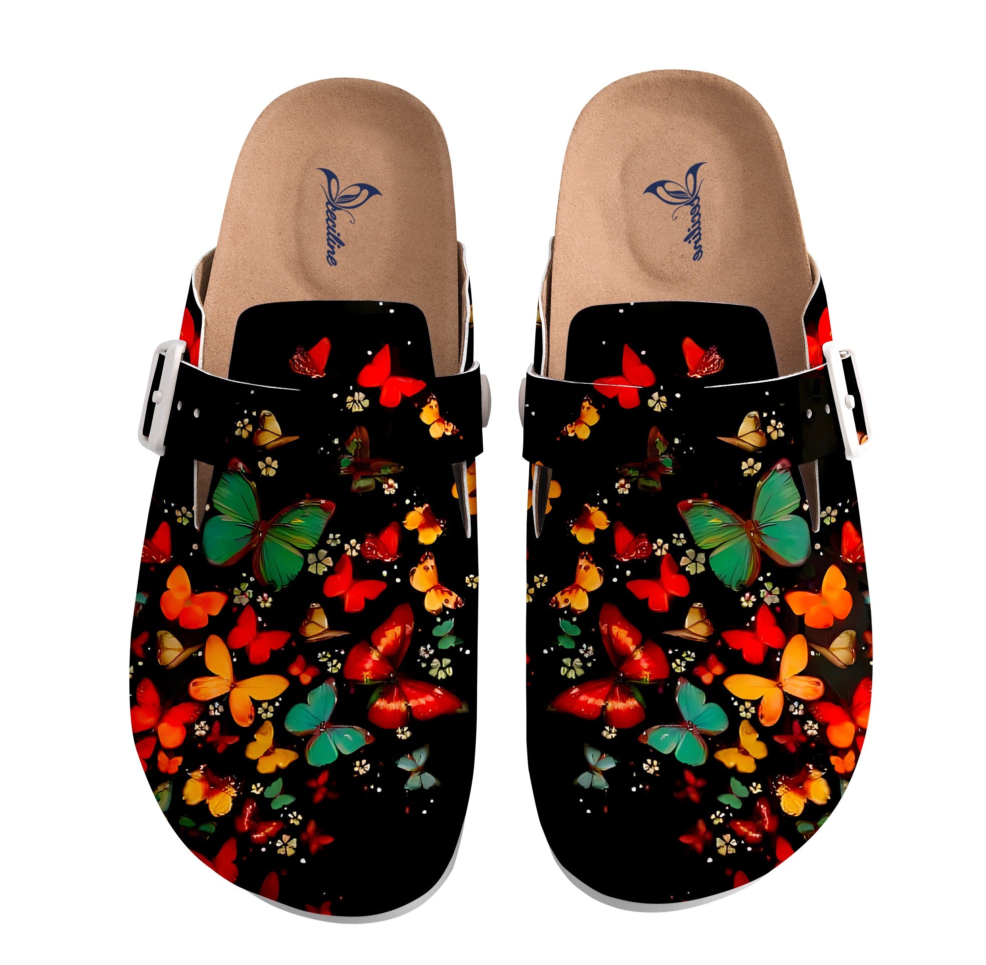 The butterflies fluttering across the scene resemble flowers blooming in the night, vibrant and full of life. The blend of red, orange, and green tones creates a vivid, colorful painting. With graceful wings and unique beauty, each butterfly adds energy and tranquility to the still background, like ethereal creatures of nature.
