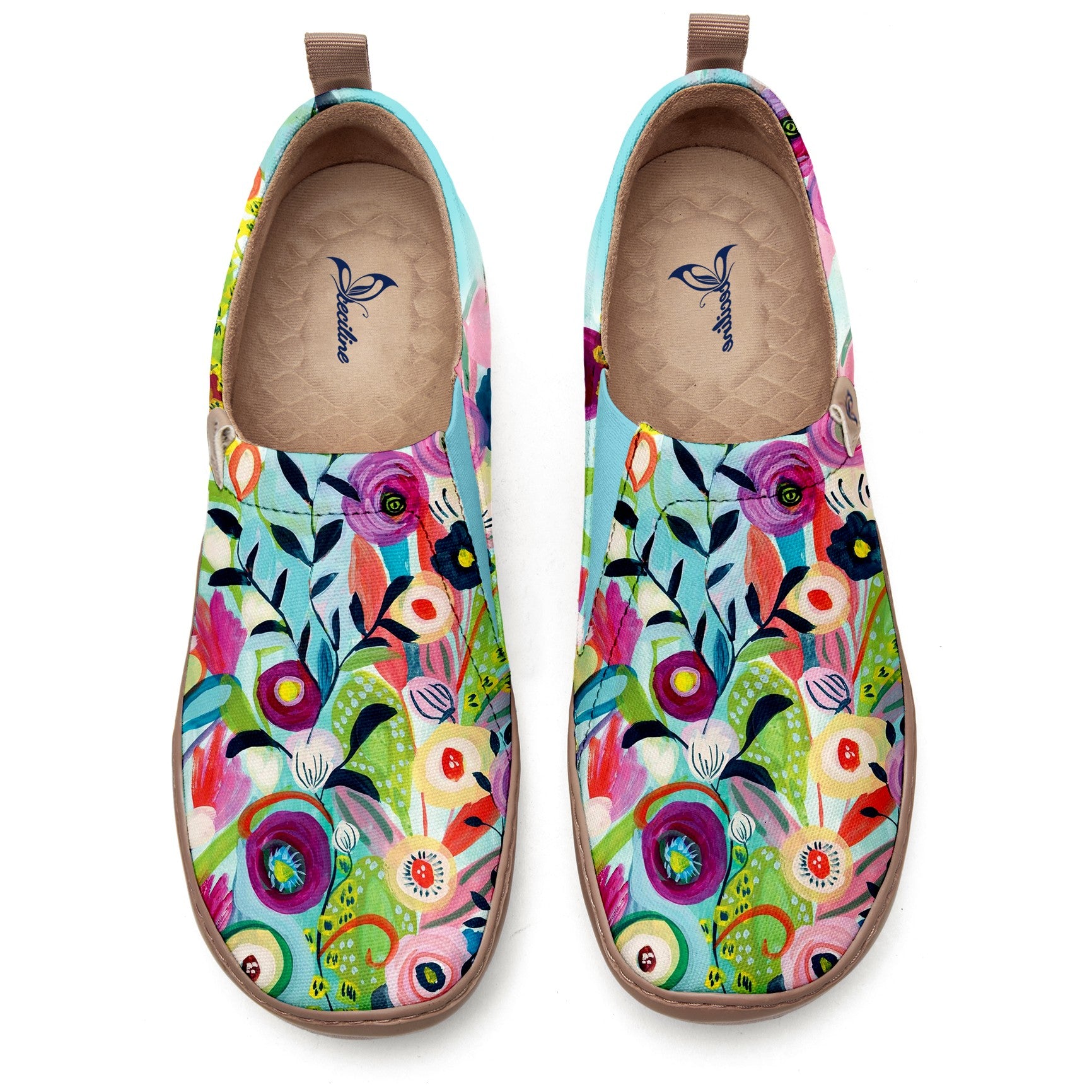 These shoes feature a vibrant floral design. The upper is covered with flowers in various shapes and bright colors—pink, purple, red, yellow—accented by deep green leaves. The flowers are presented in an abstract style, complemented by geometric decorative elements. The overall look is lively and cheerful, with strong color contrasts that create a rich artistic vibe and a summery feel.