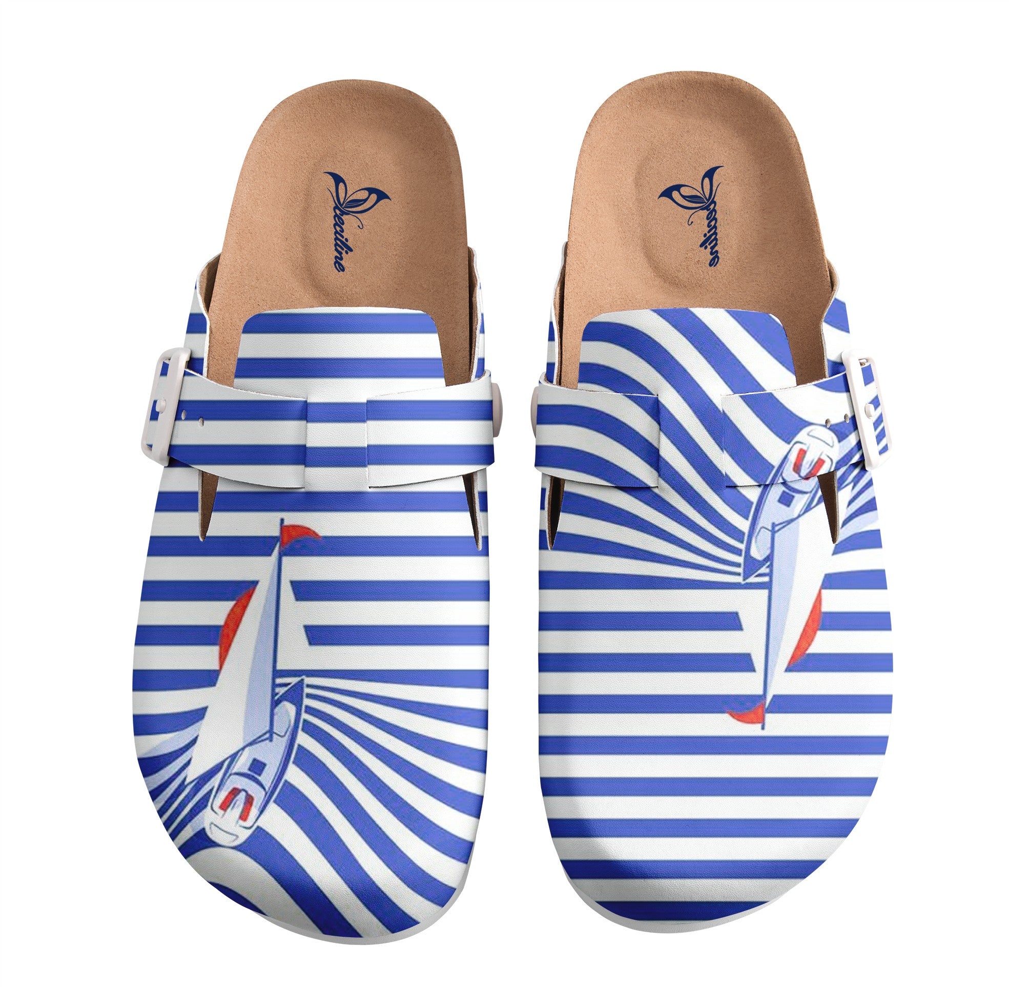 The design of this pair of shoes features blue and white stripes as the main visual element, evoking a fresh, nautical style. The stripes are arranged both horizontally and in a radiating pattern, adding a sense of visual depth and dimension. Additionally, the upper is adorned with sailboat motifs, accented with red decorative elements that further emphasize the maritime theme. The overall look conveys a relaxed, vibrant feel, full of summery seaside charm.