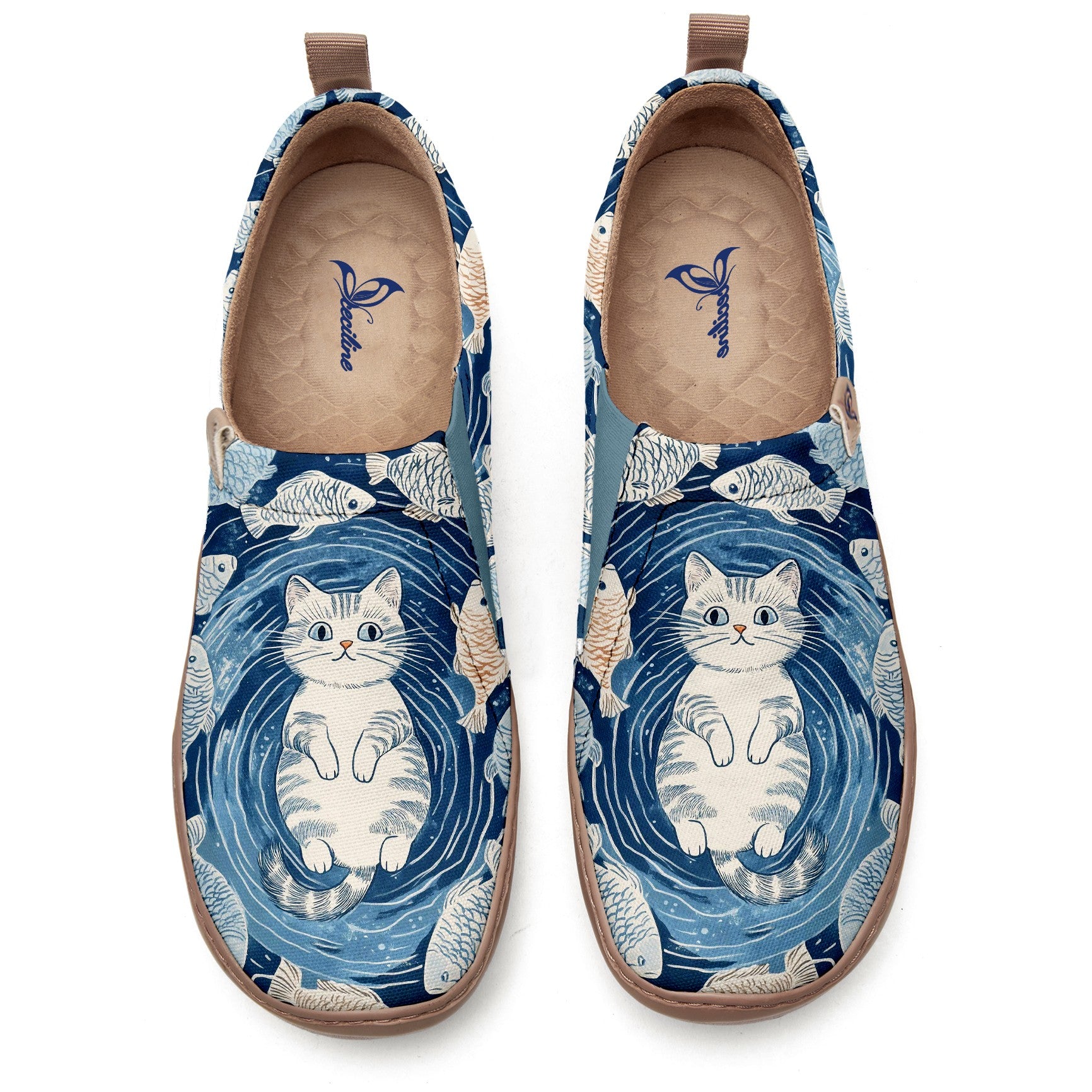 The pattern design of this pair of shoes features a blue background and presents a scene in the style of traditional Japanese ukiyo-e art. At the center of the image sits an adorable gray-and-white cat, poised within a circular pattern resembling rippling water. Surrounding it are various fish in different shapes and colors, including white and light brown. The overall composition creates a lively, playful atmosphere imbued with the charm of Eastern artistry, skillfully blending the elements of the cat and swimming fish.