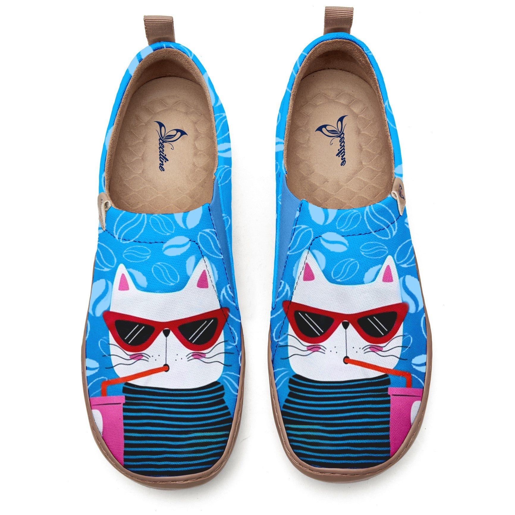 This pair of shoes features a playful and adorable cartoon design. The upper has a blue background covered with coffee latte art patterns. At the center is a cartoon cat wearing red sunglasses and a black-and-blue striped top, holding a straw in its mouth. A pink cup sits beside it, adding to the charm. The overall style is trendy and full of fun, creating a relaxed and leisurely vibe.