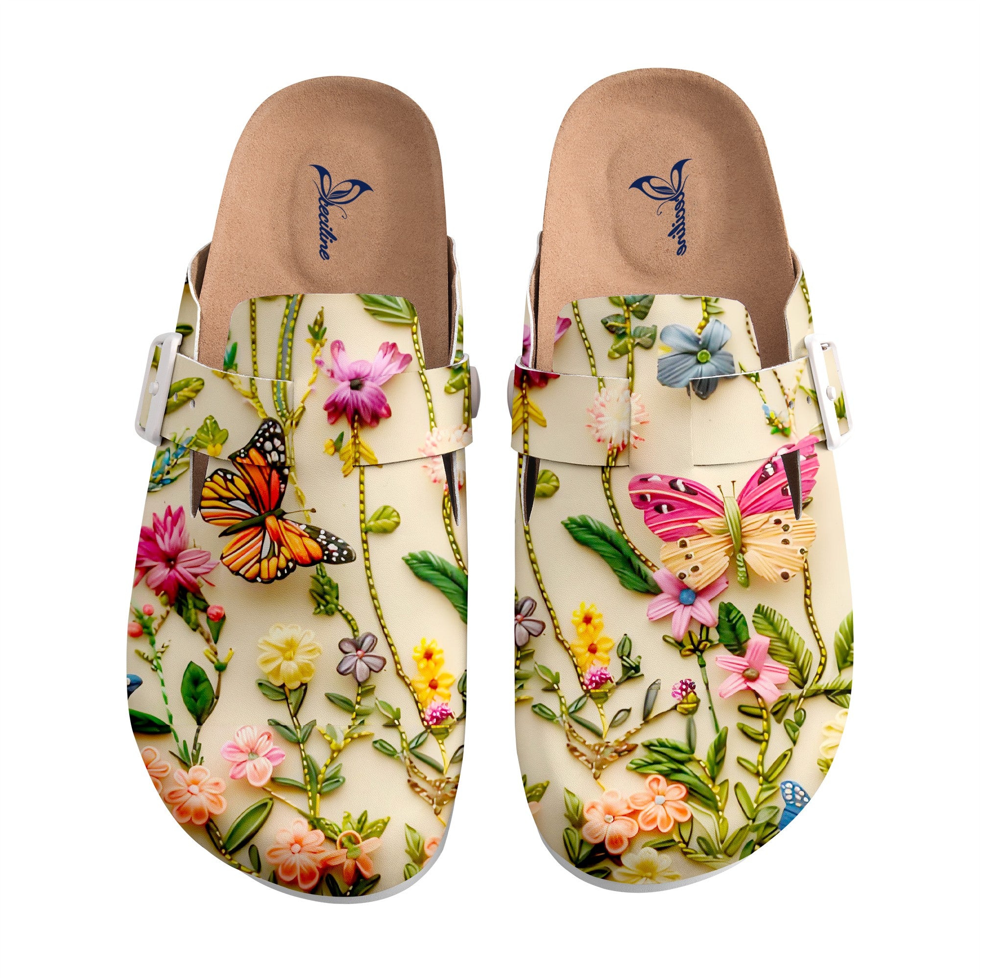 The design of this shoe features a 3D style. The base color is off-white, adorned with a variety of vibrant flowers in pink, yellow, blue, orange, and more. The flowers are diverse in shape and lifelike in appearance. A few 3D butterflies in bright colors are also added, such as the orange-and-black butterfly on the left and the pink-and-yellow butterfly on the right, complemented by green vine branches and leaves. This creates a dynamic, lively atmosphere, as if stepping into a garden, blending artistry with playfulness.