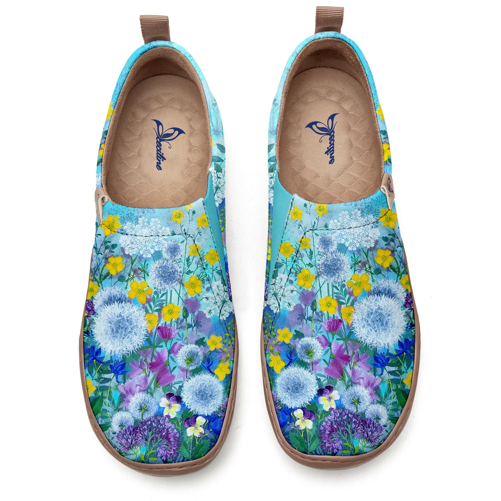 The pattern on these shoes is a fresh pastoral floral painting. With a light blue background, it is covered with dandelions, yellow blossoms, purple flowers, and more. The colors are soft and richly layered, as if you’re wearing an entire summer meadow on your feet. The delicate brushstrokes create a natural, soothing atmosphere, almost as if you can smell the fragrance of the flowers.