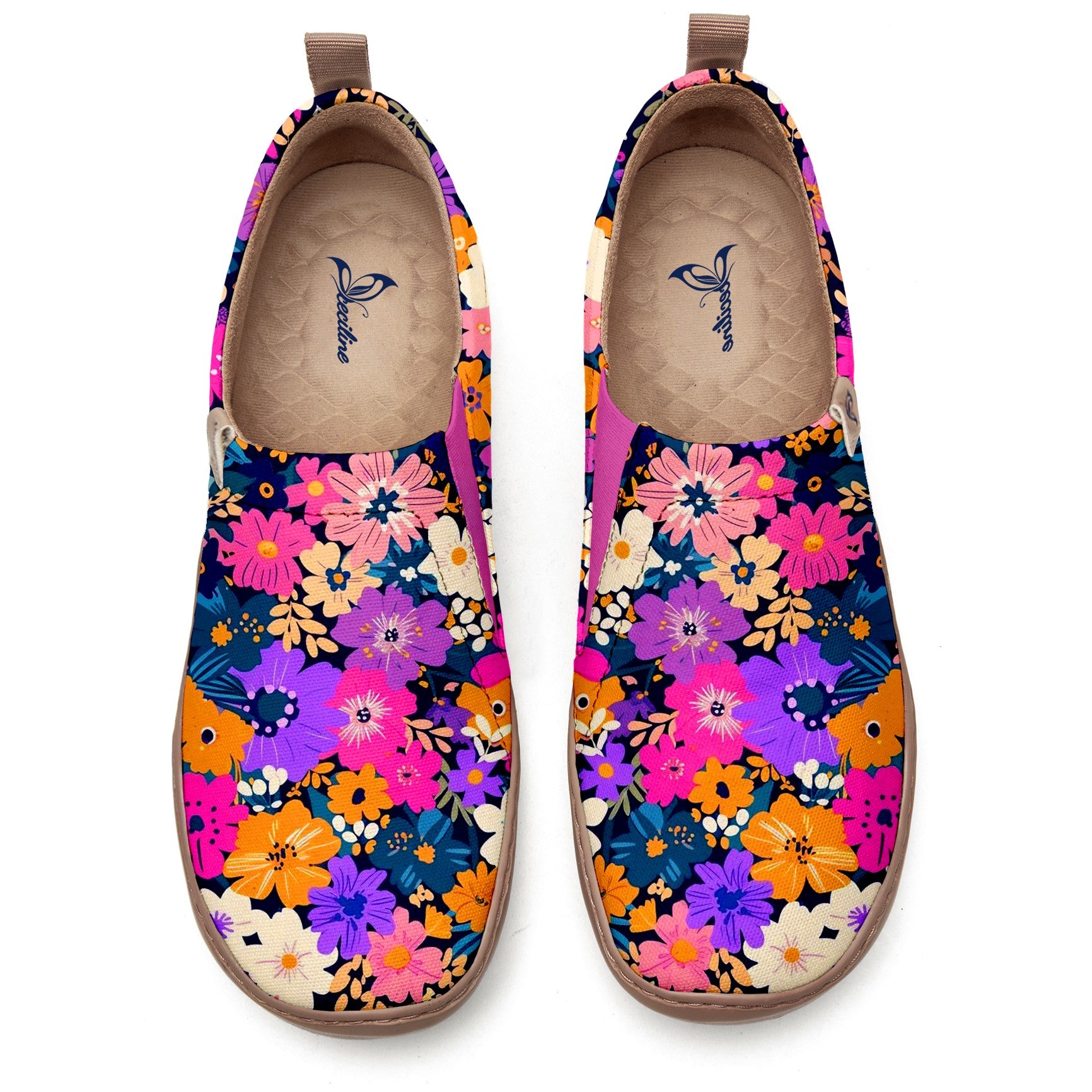 The upper is set against a deep navy background, covered in a variety of colorful, uniquely shaped blossoms. Pink, purple, orange, and white flowers intertwine harmoniously, accented with green leaves and delicate branches. The result is a lively and energetic atmosphere, bursting with vitality and charm. The overall style is bright and cheerful, as if a blooming, multicolored flower field has come to life on the surface of the shoes.