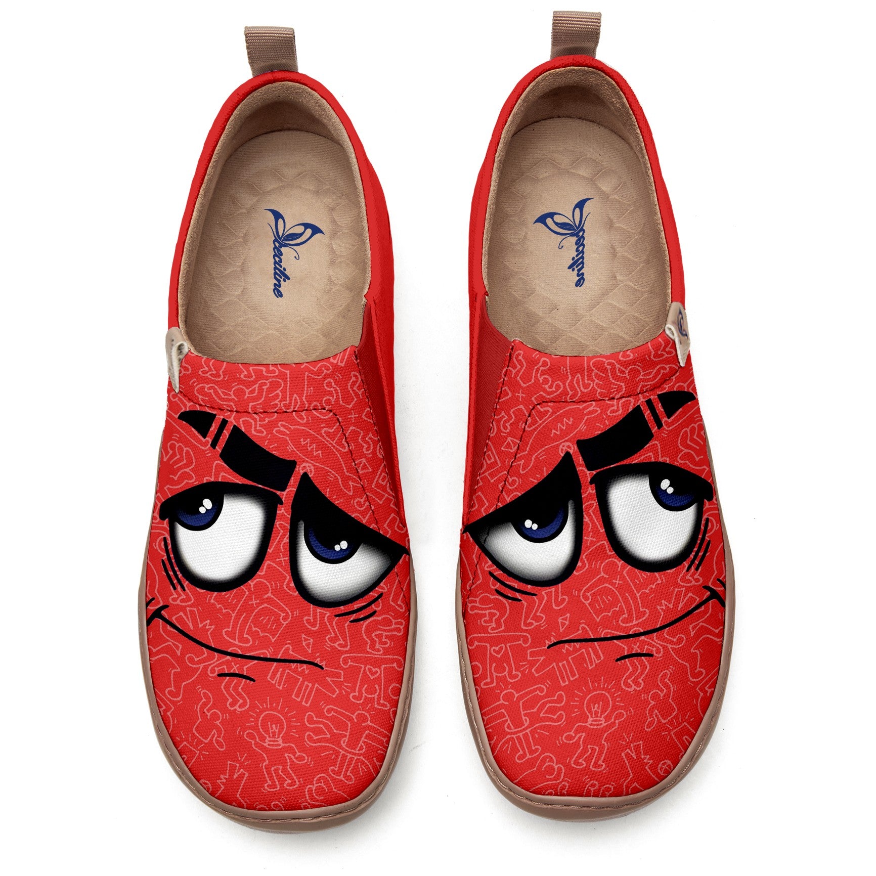 This pair of shoes features a fun and playful cartoon expression design. The upper has a red base color covered with light red simple line drawings. Prominently displayed are large cartoon eyes, paired with black eyebrows and a mouth, presenting a slightly helpless or melancholic expression. The design is vivid and expressive, with an overall humorous and quirky style full of personality.