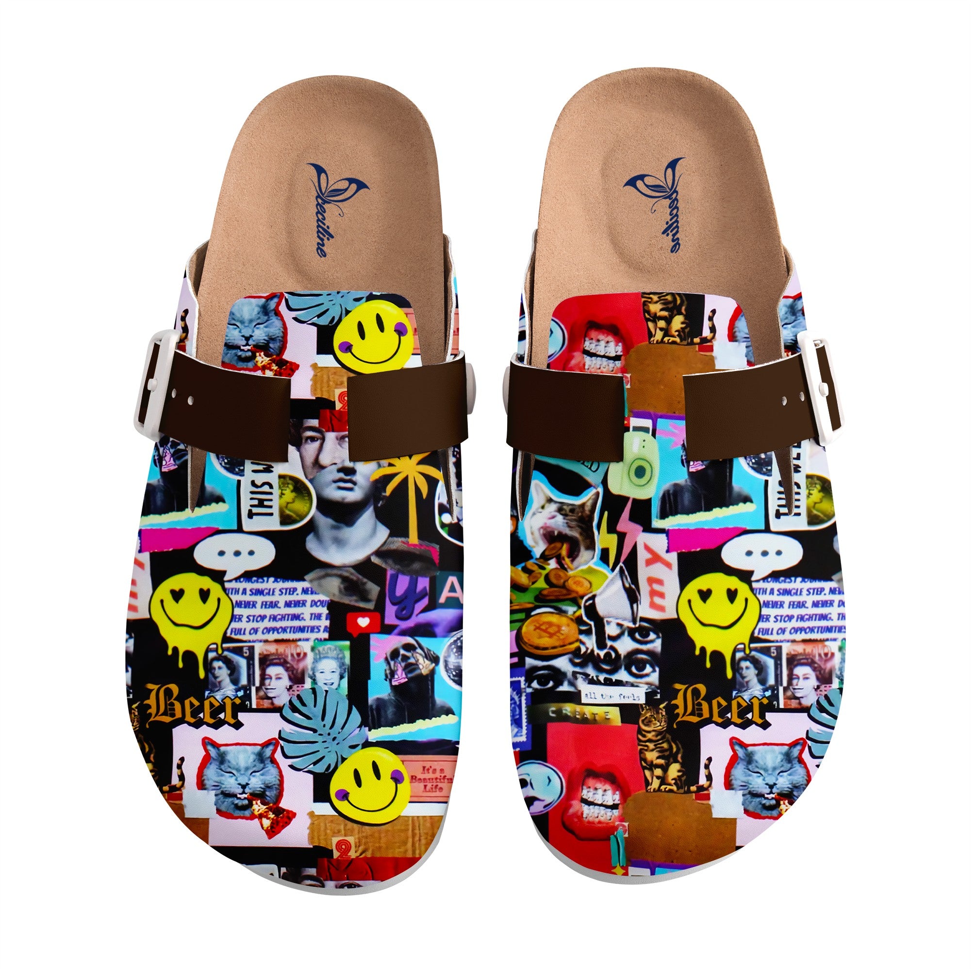 The design of these shoes is infused with street style and pop art aesthetics. The upper is covered with vibrant, eclectic collage patterns, featuring yellow smiley faces, cat portraits, human silhouettes, palm trees, tiger imagery, and more. There are also elements like the word "Beer," speech bubble shapes, and motivational phrases such as "WITH A SINGLE STEP, NO MOUNTAIN IS TOO HIGH." The various patterns interweave, and the bold color contrasts create a lively, unique, and dynamic visual effect.
