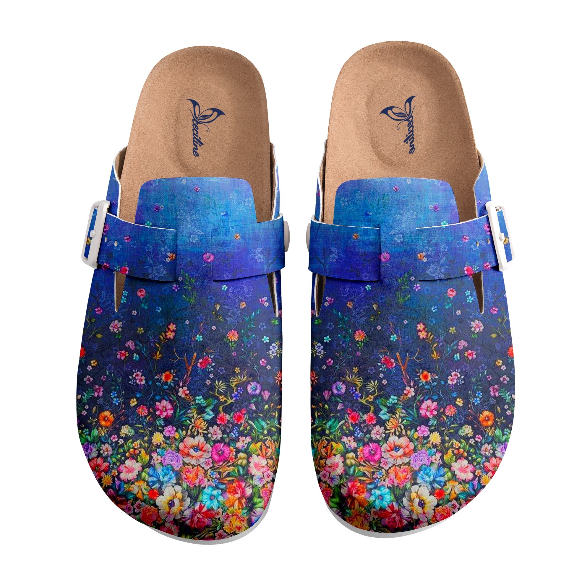 This design showcases a vibrant sea of flowers set against a background that fades from deep blue to purple, resembling a starry night sky. The bright flowers float in this dreamy galaxy, creating a rich sense of depth with unique colors ranging from bright pinks and oranges to soft blues and purples. The overall design is modern yet romantic, evoking thoughts of life's continuity and the beauty of nature, filled with vitality and hope.
