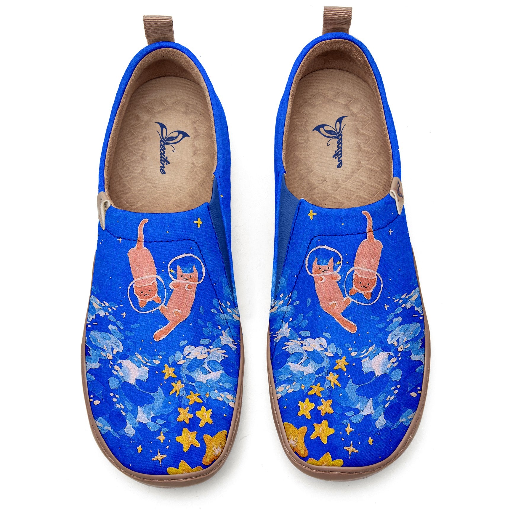 These shoes feature a blue base color with a pattern of several orange cats wearing astronaut helmets. They “float” against a backdrop resembling a starry sky and clouds, sprinkled with yellow stars. The scene is full of whimsy and fantasy, as if the cats have embarked on a space adventure.