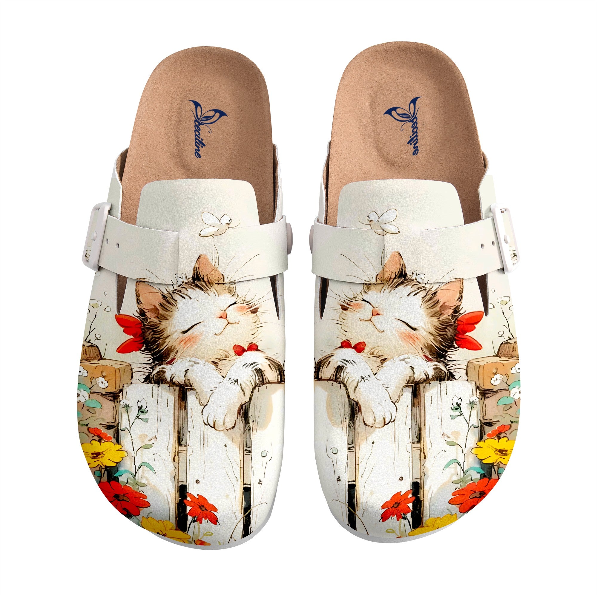The design of this shoe is warm and adorable. The main feature is a kitten wearing a red bow, its eyes gently closed in a relaxed expression, lying on a light-colored wooden fence. Surrounding it are vibrant flowers and a few delicate butterflies fluttering about. The overall design creates a peaceful, sweet countryside atmosphere, evoking a sense of comfort and healing.