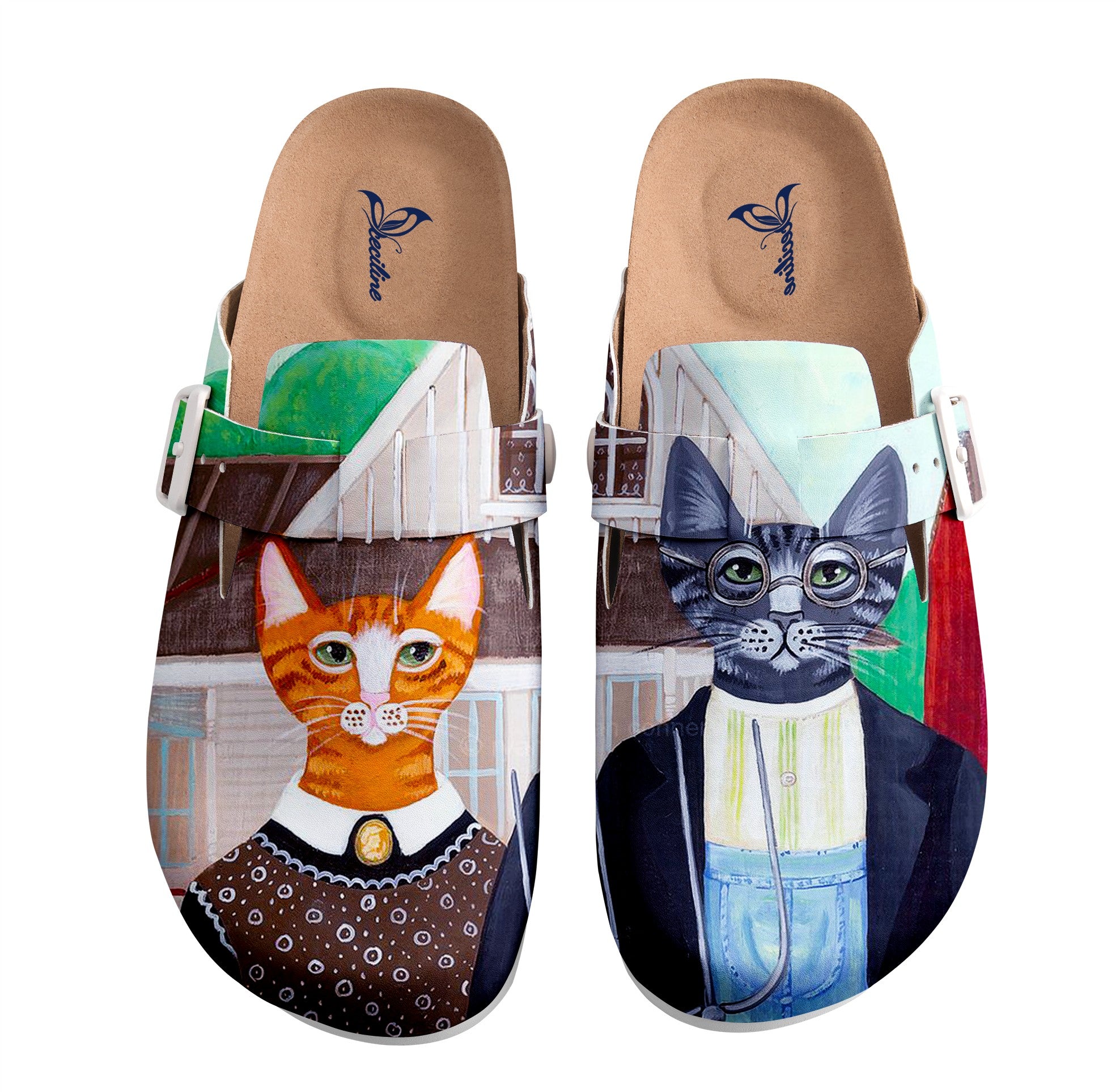 The design of this pair of shoes is both imaginative and delightfully creative, centered around a cat theme. Each shoe features a different feline character. On the left shoe, there's an orange-and-white cat dressed in an outfit with polka dots and a white collar, adorned with a golden accessory on its chest. On the right shoe, a gray-and-black cat wears glasses and is dressed like a doctor, complete with a stethoscope around its neck. The background includes elements of architectural structures, creating a retro yet playful atmosphere. It feels as if the cats are playfully reenacting scenes from human life, blending artistry with a sense of fun and whimsy.