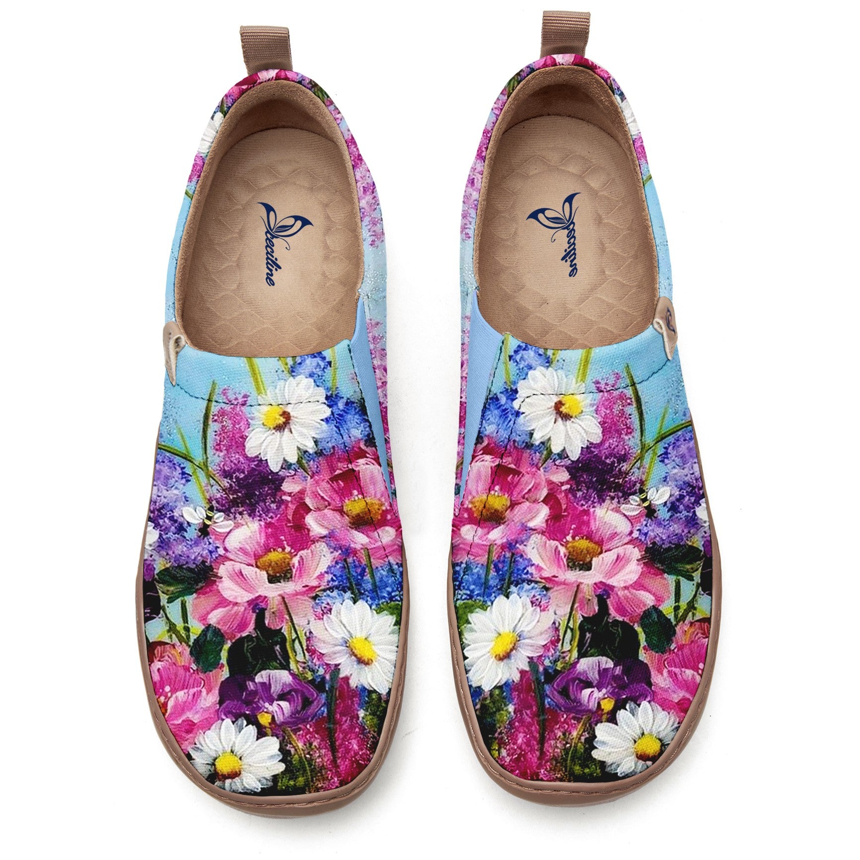 These shoes feature a floral pattern design. The upper is adorned with a variety of brightly colored flowers, including pink, white, and purple blossoms, paired with green leaves. The flowers are realistically shaped with smooth color transitions, creating a fresh, romantic, and vibrant atmosphere. It feels as if you’re walking through a blooming garden, with a style that is both elegant and full of natural charm.