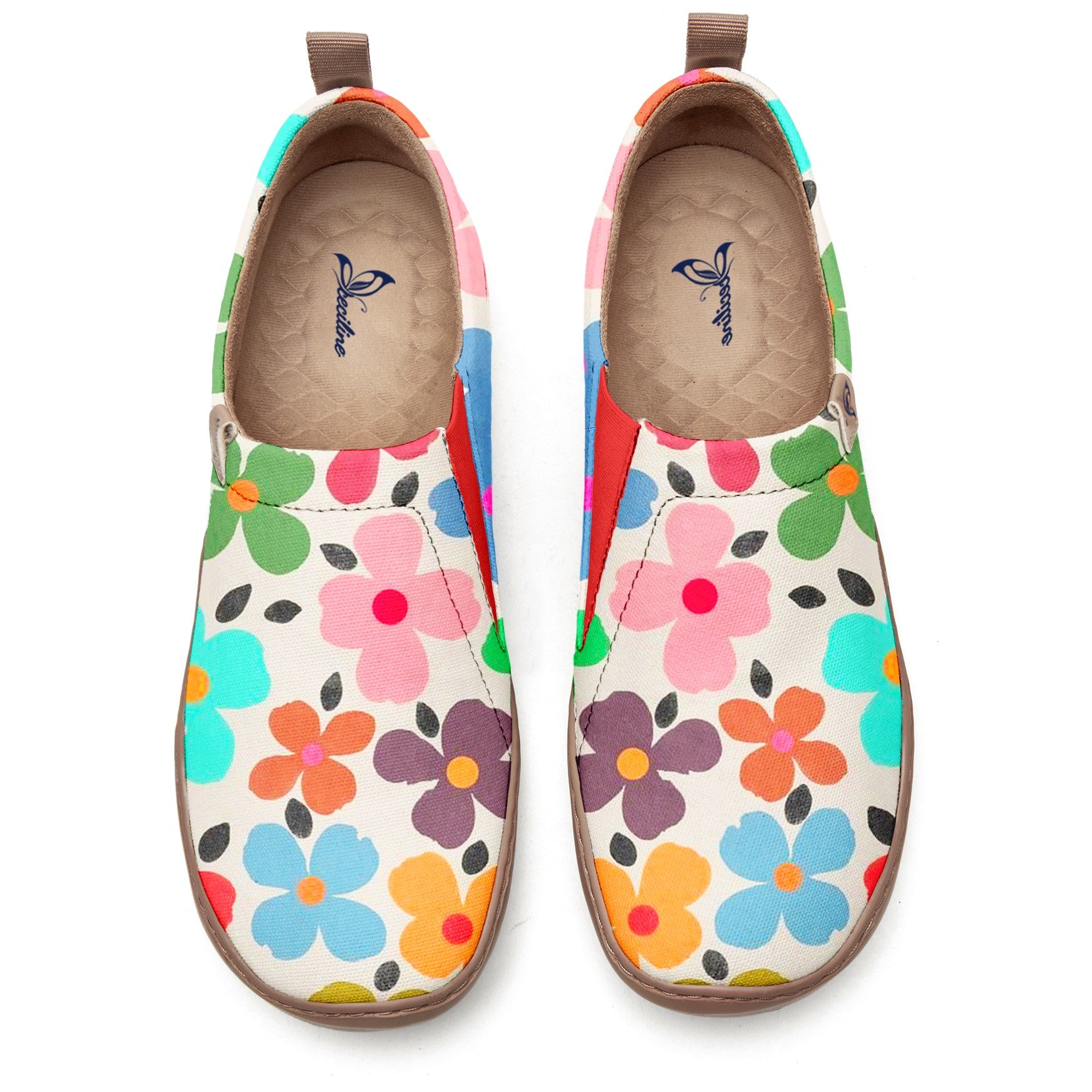 This pair of shoes features a lively and cheerful design. Set against a white background, the upper is adorned with colorful floral patterns in pink, green, blue, orange, purple, and more—each flower with a uniquely colored center that adds visual interest. Black leaf motifs are scattered among the blooms, enhancing the sense of depth. A bold red panel on the side adds a vibrant accent, bringing the whole design to life. The result is a playful, joyful aesthetic full of personality and energy.