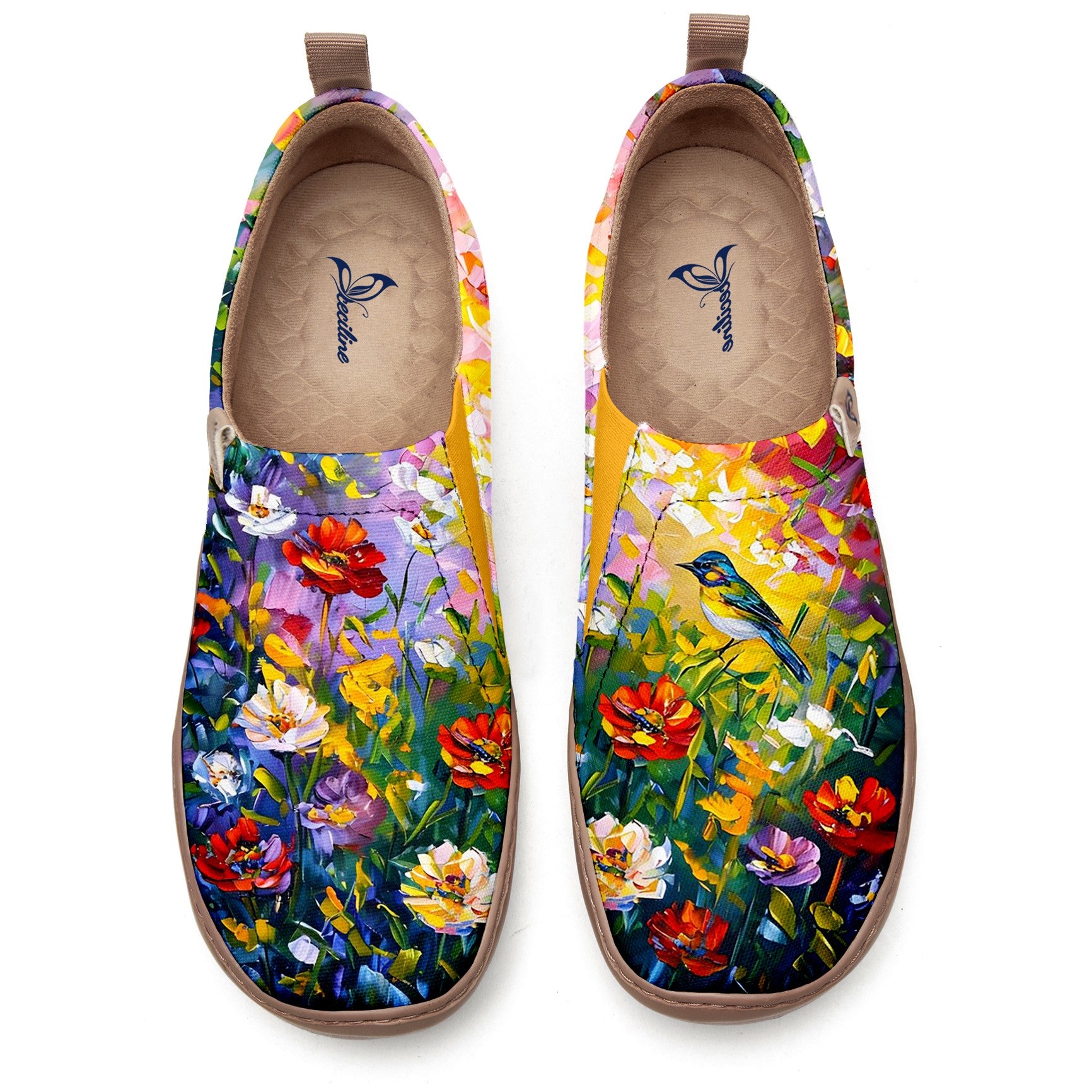This pair of shoes features an oil painting-style design with a nature-inspired theme. The upper is adorned with a profusion of colorful flowers—red, yellow, white, and purple blooms intertwined with green foliage—creating the impression of a lush flower field. A brightly colored bird is painted on the right shoe, adding a lively and dynamic touch. The overall style is vibrant, full of vitality, and rich in artistic flair.