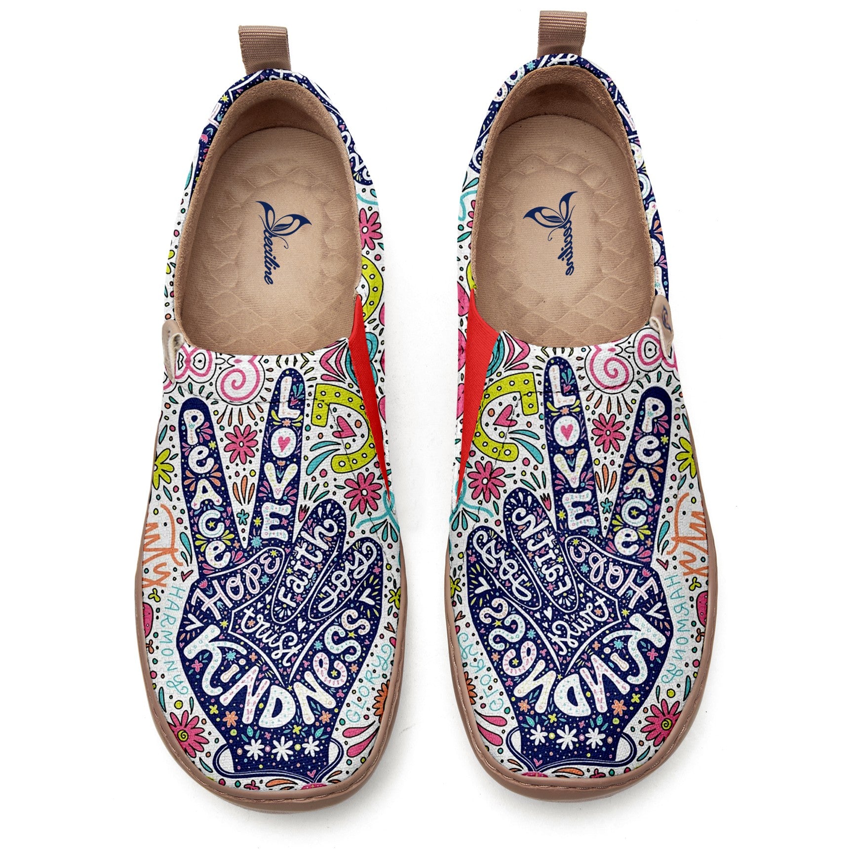 These shoes have a white base color and feature an artistic design full of hippie spirit. Two hand shapes dominate the shoe surface, each containing words like “PEACE,” “LOVE,” and “KIND.” They are complemented by colorful flowers, hearts, wavy lines, and other decorative elements. The vibrant colors and free-spirited style convey a positive and warm outlook on life.