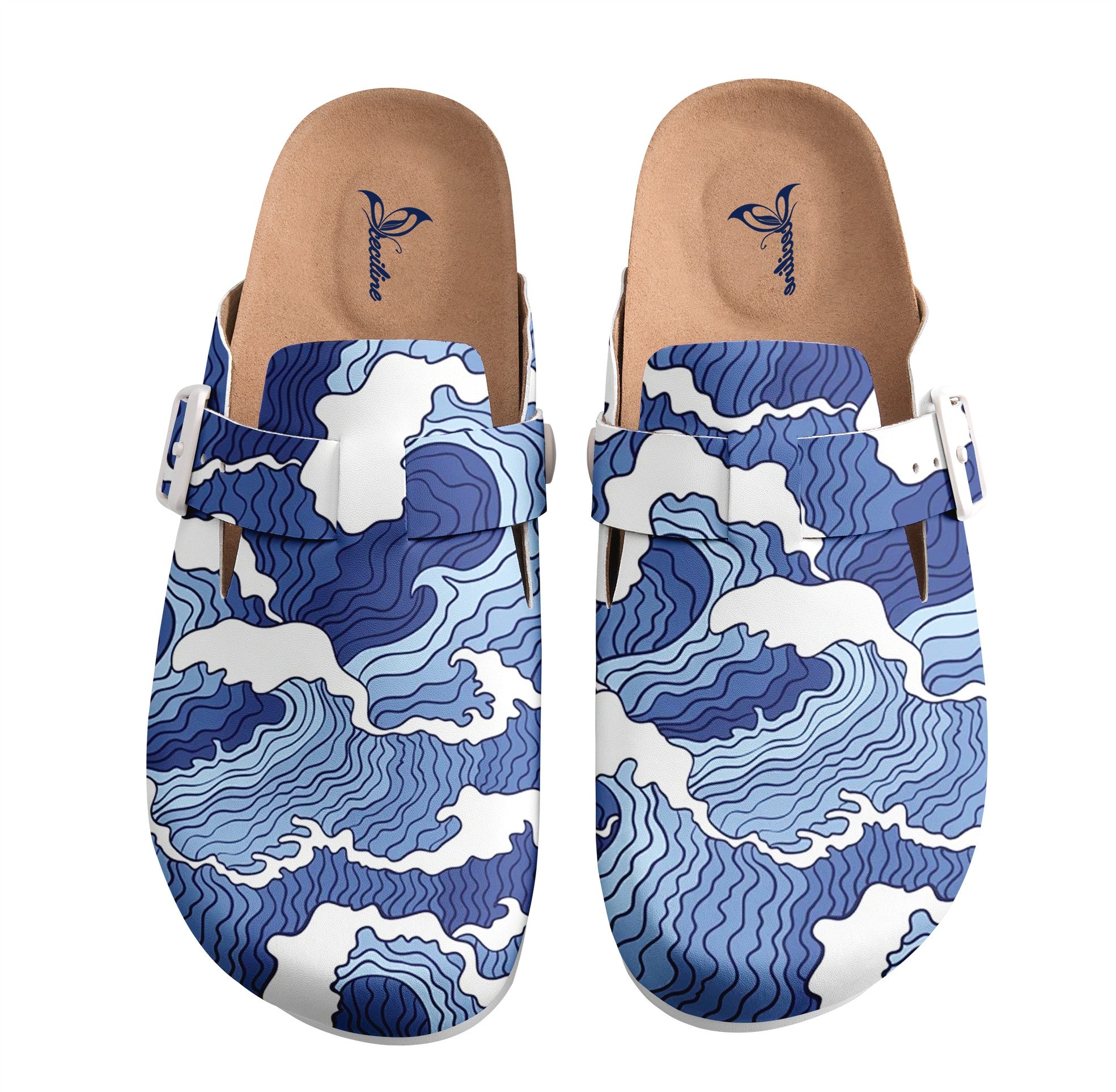 The design of this pair of shoes draws inspiration from the elements of ocean waves. Featuring a primarily blue and white color palette, the blue tones range from light to deep, with smooth, flowing lines outlining layers of rolling waves. The white accents mimic the frothy crests of the surf, creating a sense of movement and rhythm reminiscent of the sea. The overall effect evokes the vast, dynamic beauty of the ocean, infused with a strong coastal vibe and a touch of artistic elegance.