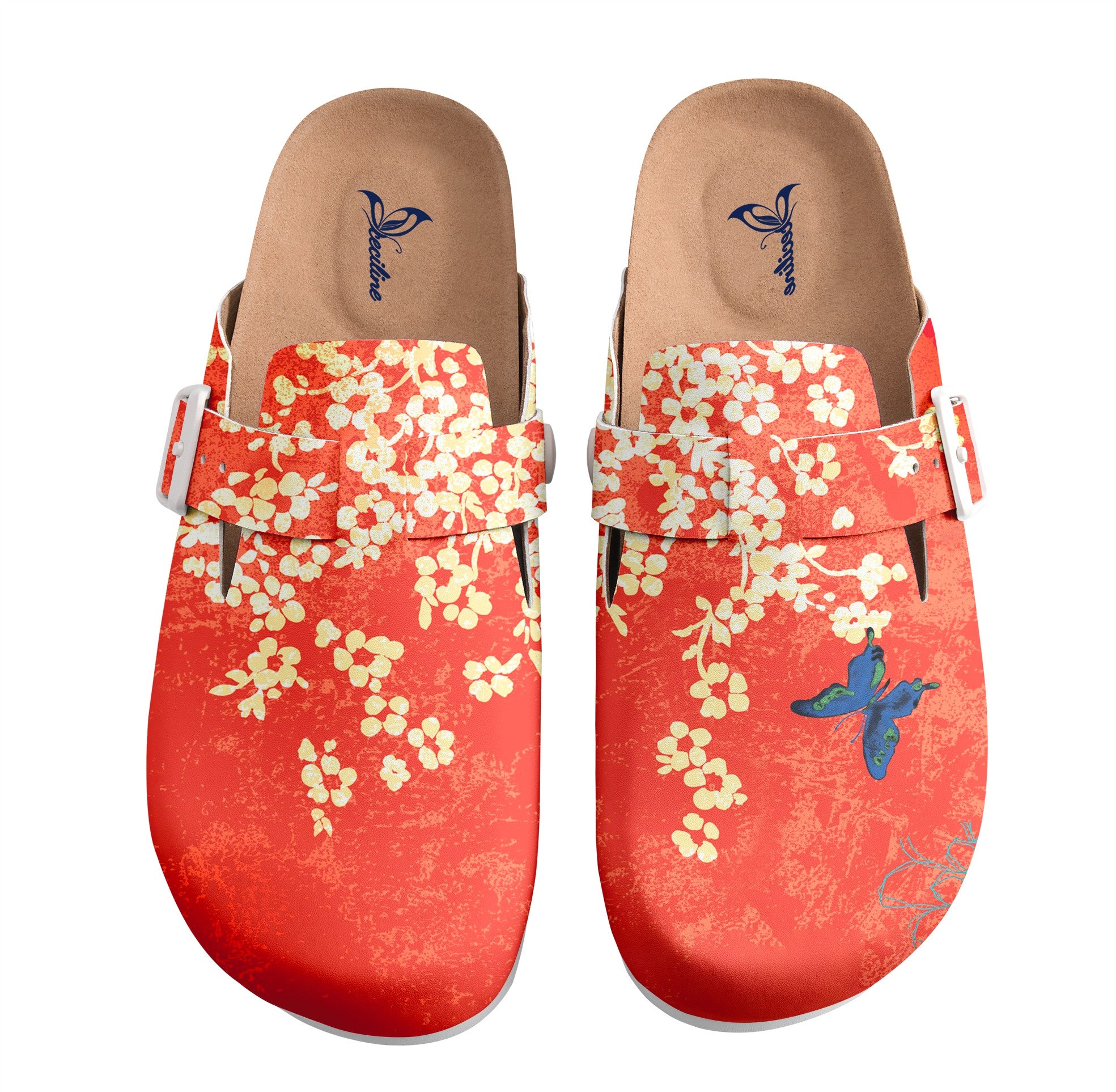 The design of this pair of slippers is rich in charm and character. Dominated by a vibrant red tone, the overall look exudes warmth and intensity. The upper is adorned with off-white floral patterns, scattered gracefully as if blooming and spreading naturally. A single blue butterfly graces the right slipper, adding a lively and dynamic touch. The surface also features a distressed texture effect, blending vintage elements with bold colors to create a unique and artistic style.