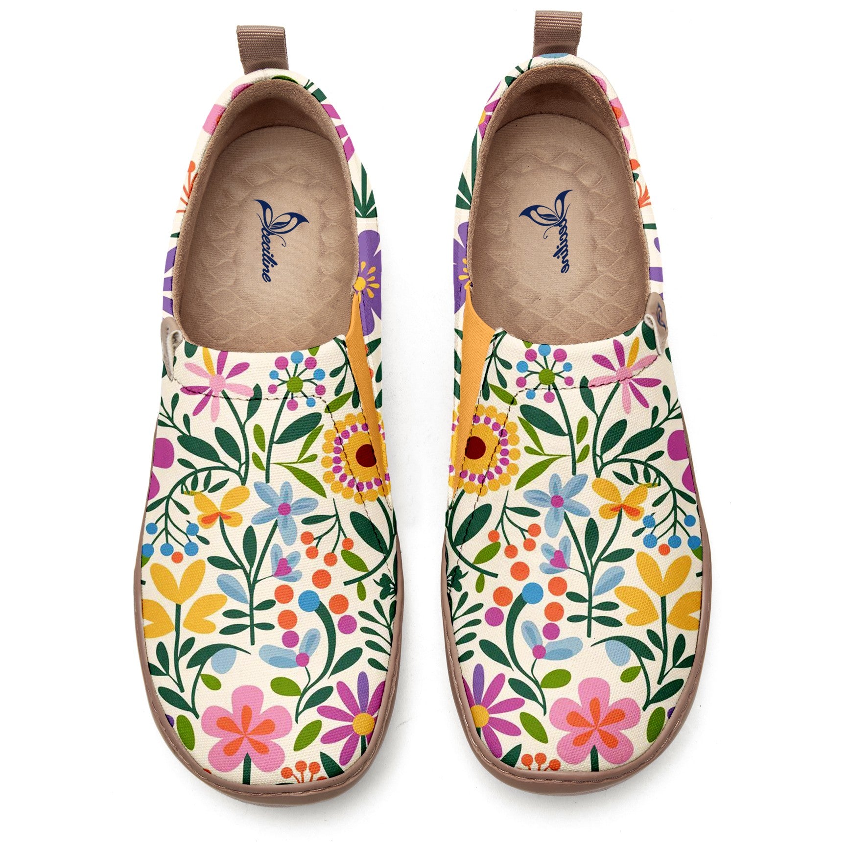 This pair of shoes features a vibrant floral design. Set against a light-colored background, the upper is adorned with a variety of colorful flowers in pink, yellow, blue, purple, and more, complemented by green leaves and playful multicolored dots. The flowers are arranged in a lively, scattered pattern, creating a cheerful and energetic style full of natural vitality and a touch of childlike whimsy.