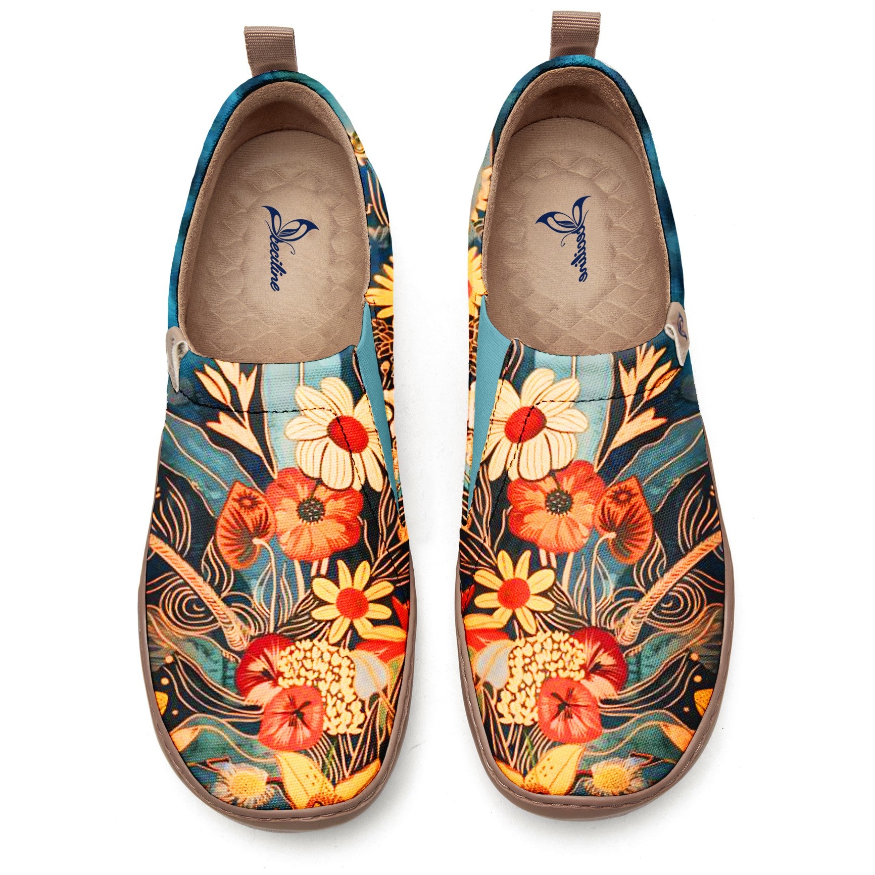 These shoes feature a vibrant floral design. The upper is set against a blue-green background, adorned with a variety of brightly colored flowers in shades of orange-red, yellow, and white. The blossoms vary in shape and size, complemented by leaves and swirling vines that form graceful curves and spirals. The overall look creates a natural yet artistic atmosphere, bursting with energy and life.