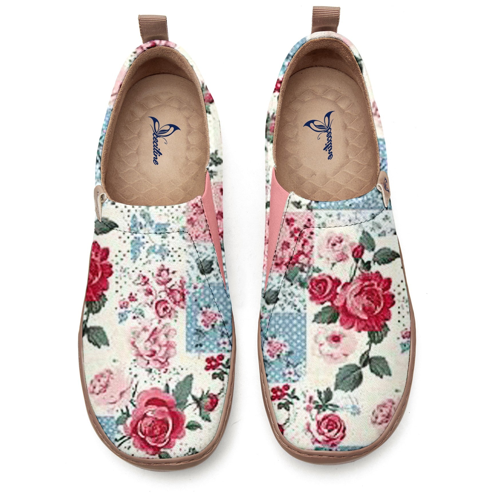 These shoes feature a light-colored base, with a pattern of classic floral elements. The main design consists of roses in various shapes, with vibrant reds and soft pinks, complemented by deep green leaves. The pattern is presented in a patchwork style, with squares in different colors and prints stitched together, accented by small patterns such as blue and white polka dots. The overall design evokes a retro countryside vibe, exuding a romantic and elegant atmosphere.