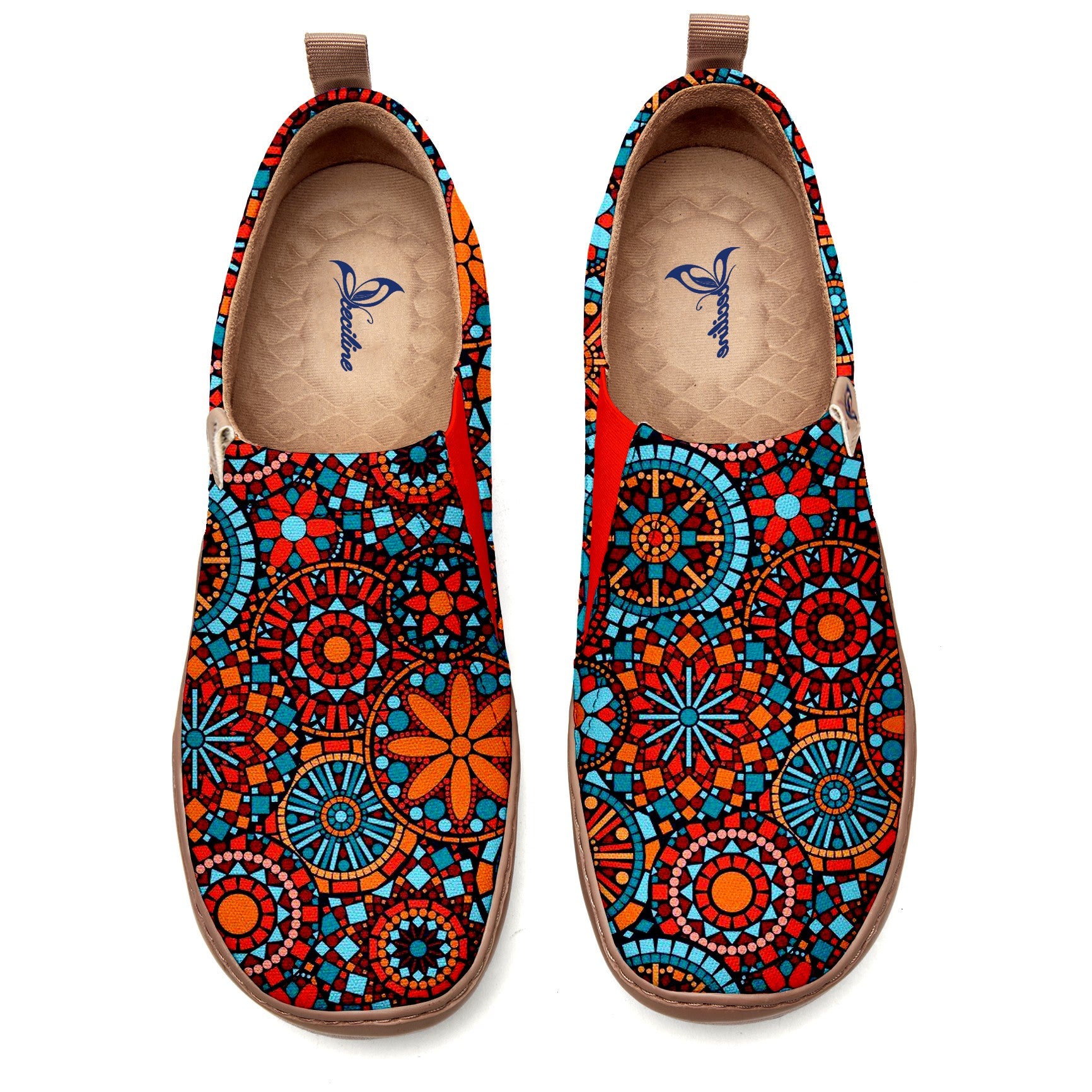 The pattern on these shoes features a colorful mosaic collage style, with red, blue, and orange as the dominant tones. Geometric shapes—such as squares and circles—are pieced together to form intricate floral and radiating motifs, reminiscent of stained glass or tiled artwork. The design is rich in artistic flair and vintage charm, with bright yet harmonious colors that evoke a strong sense of ornamentation and exotic appeal.